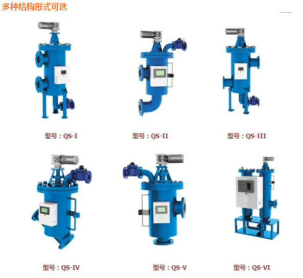 d、自清洗過濾器結(jié)構(gòu)形式分為:同側(cè)進(jìn)出、左下進(jìn)右上出、左進(jìn)右出、斜插型、并聯(lián)式等。